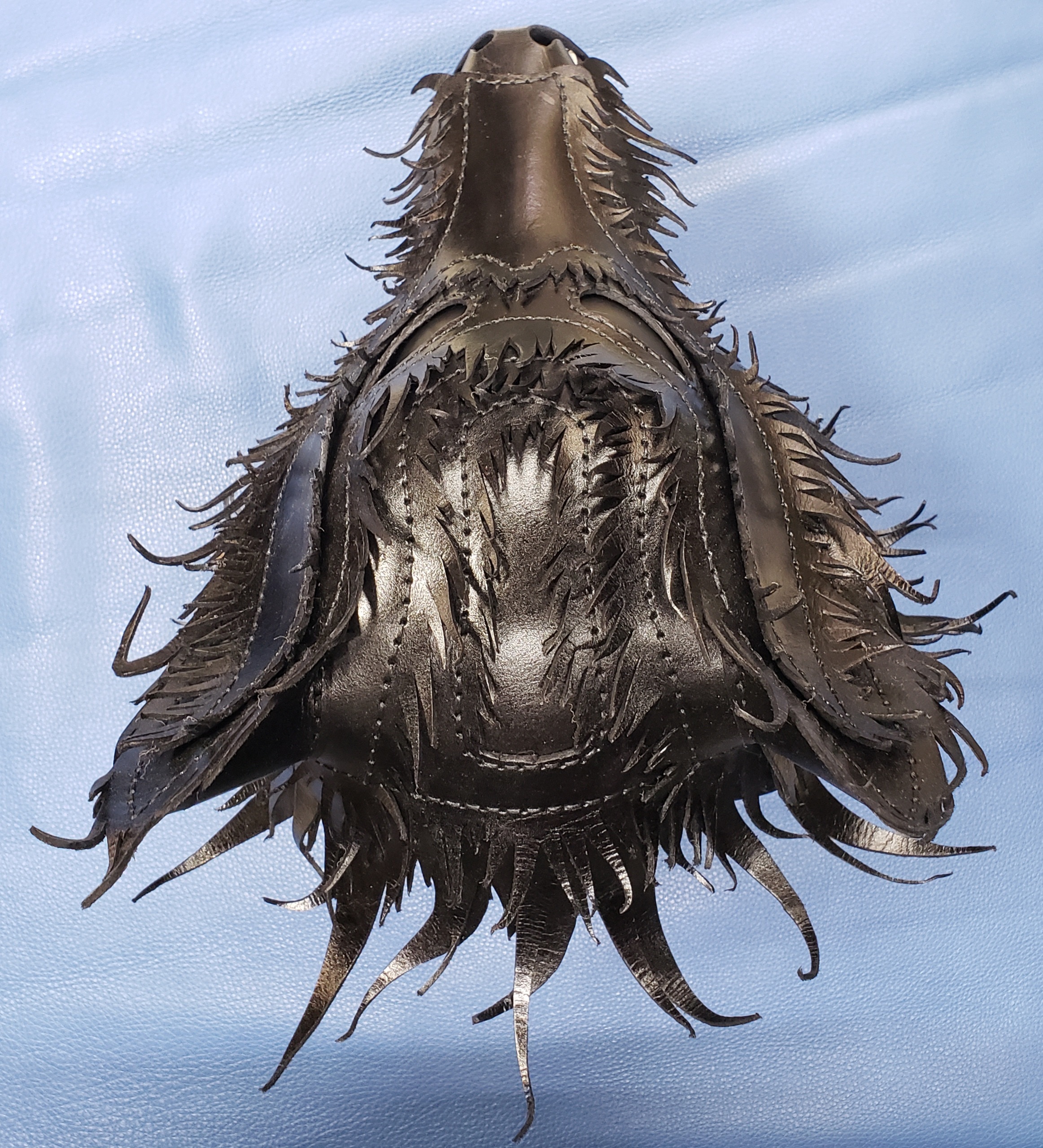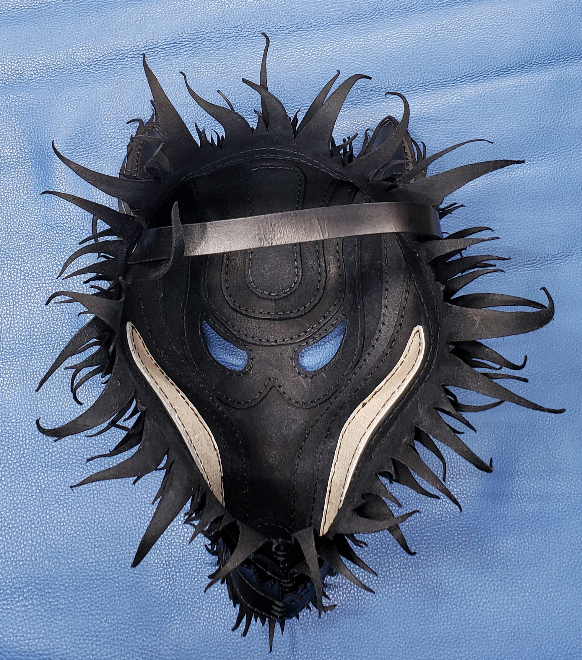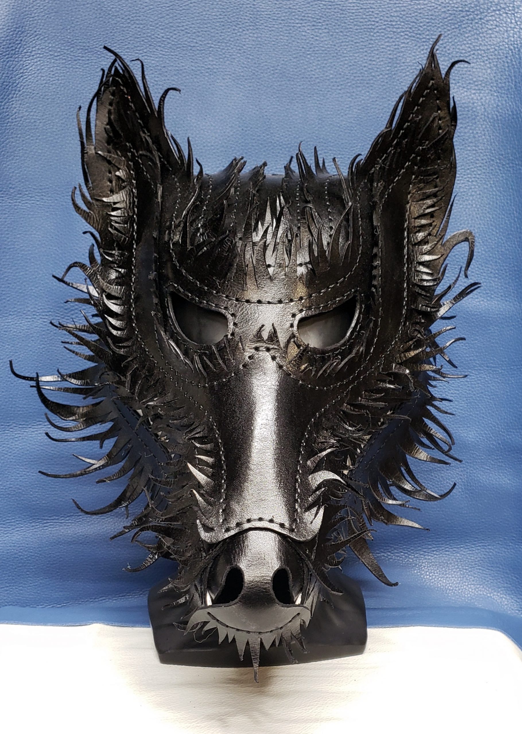 Mask measures 16in x 10in x 8in.   Made with hand dyed vegetable tanned leather and handsewn with 1mm waxed thread and nickel-plated hardware.