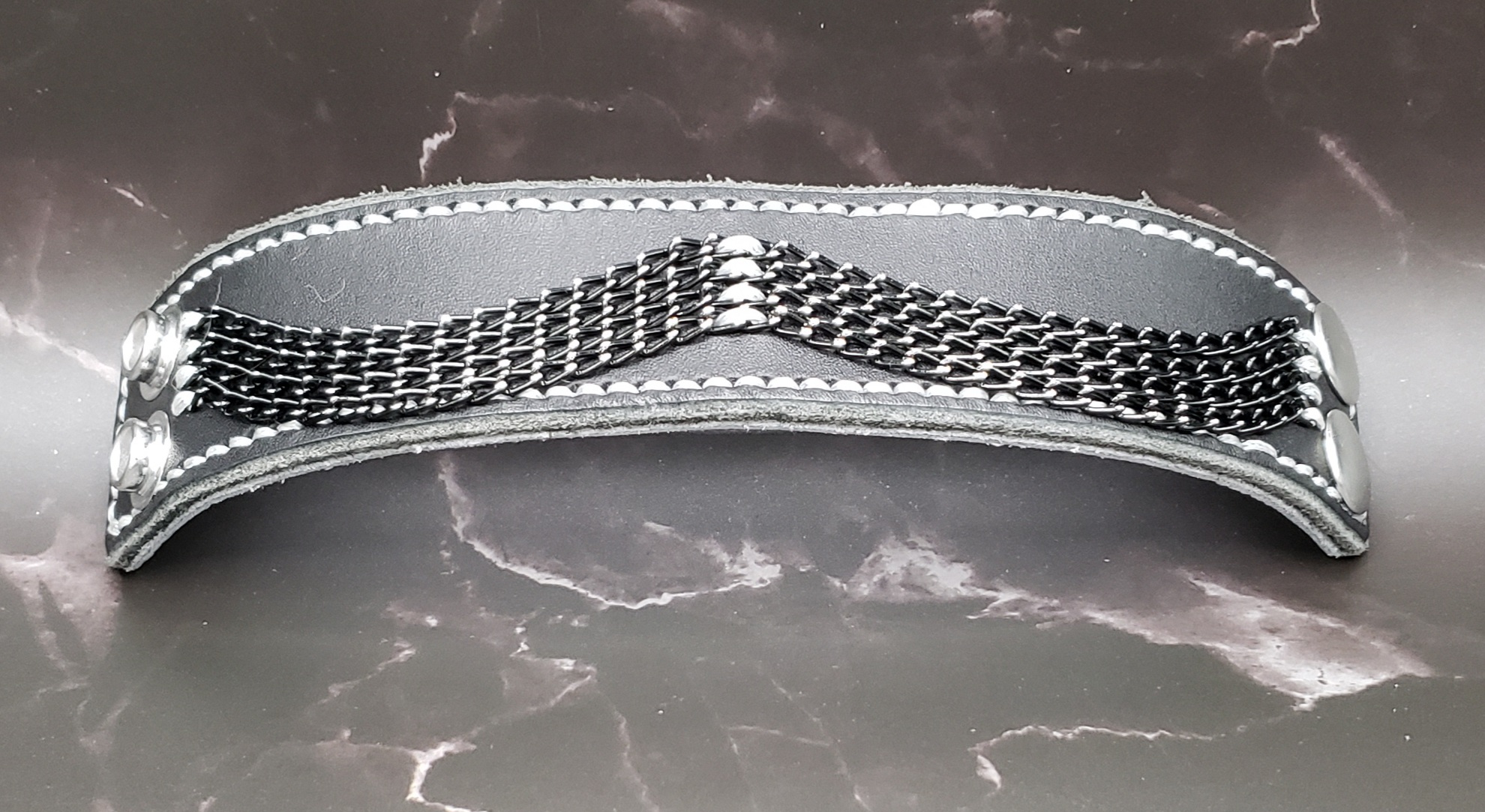 Strands of lightweight black curb chain are sewn on with silver waxed thread matching the perimeter stitching.