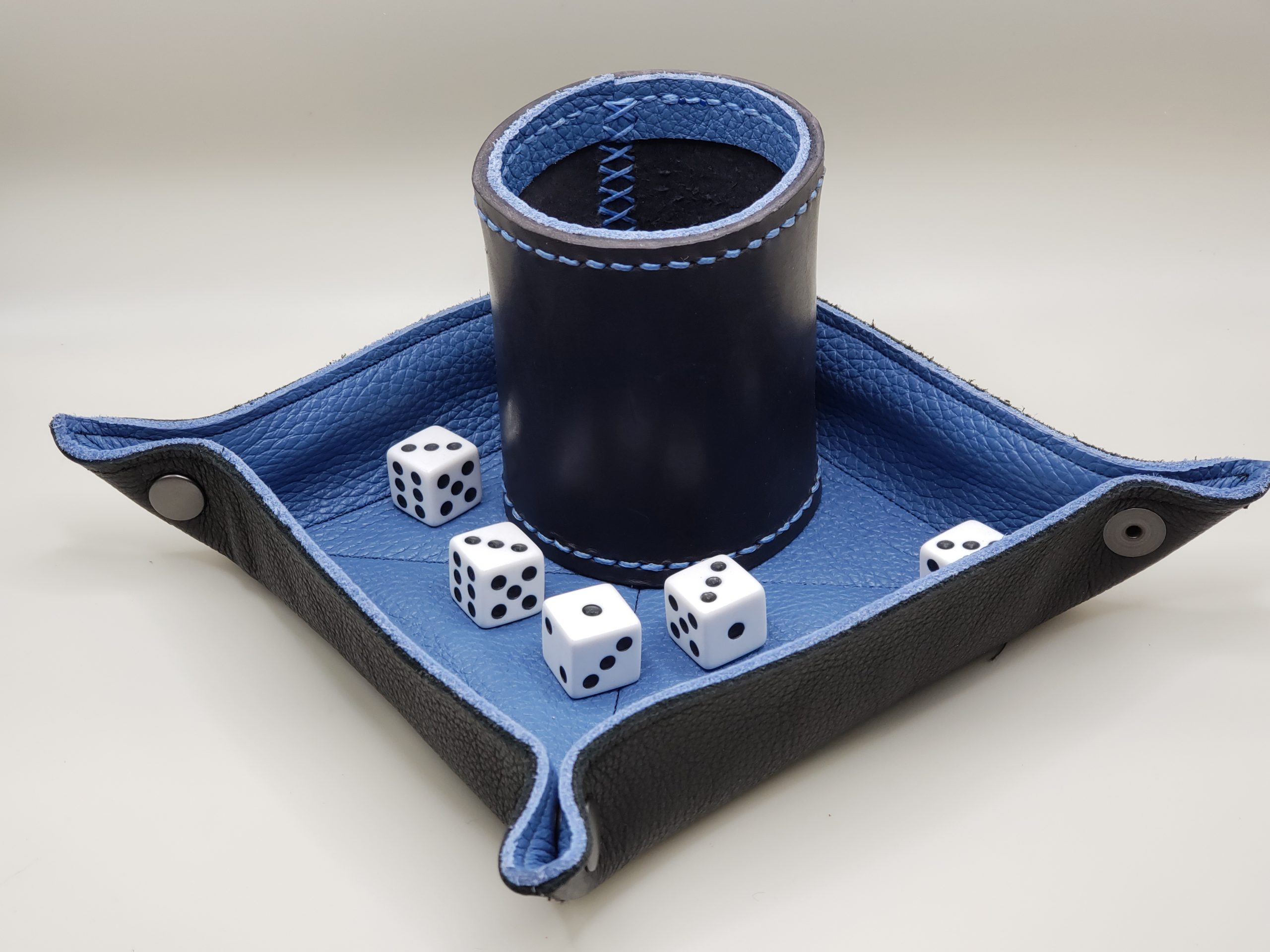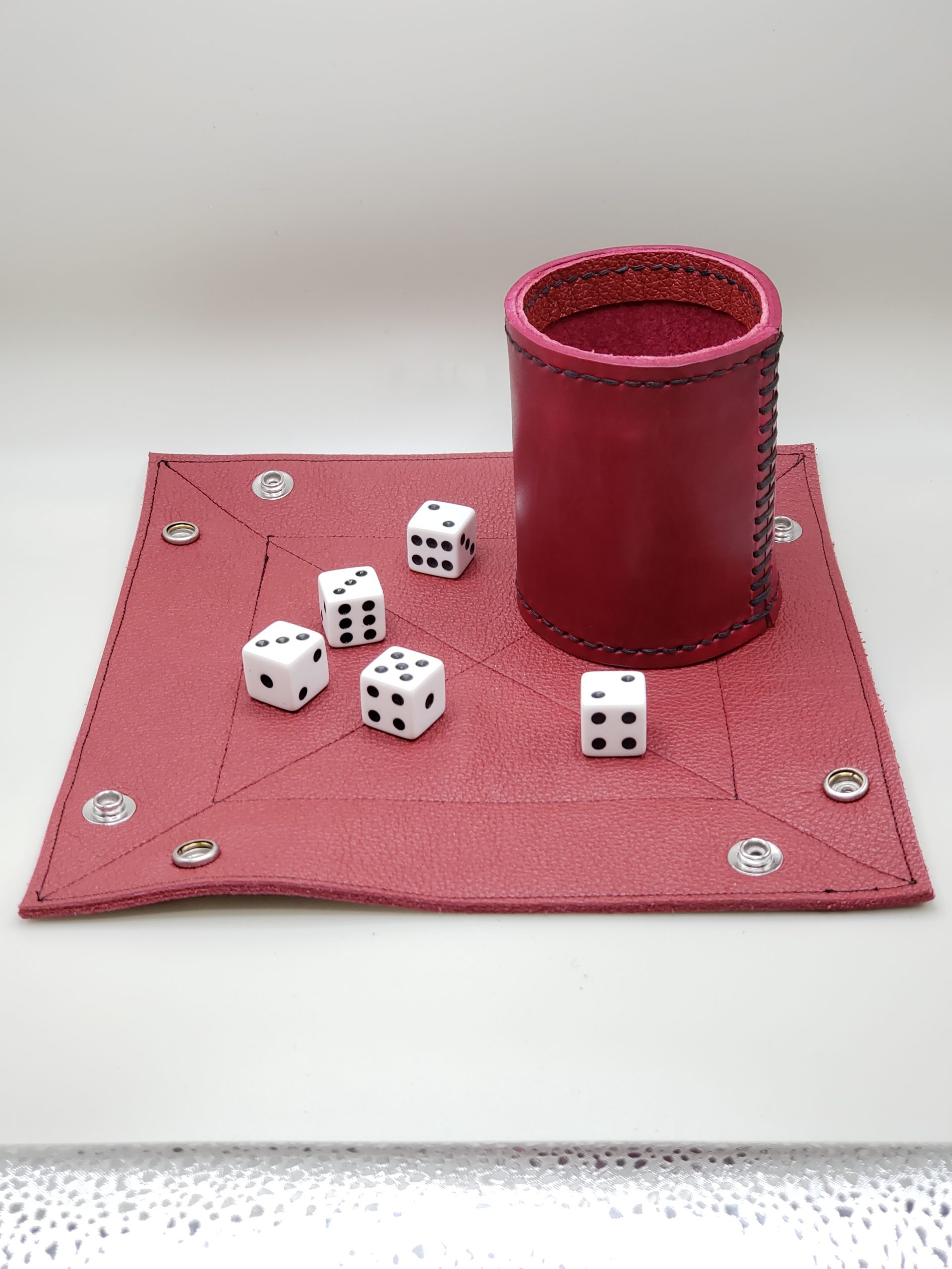 The Dice Tray is made with 2 sewn layers of durable garment leather and nickle-free corner snaps. The Dice Cup is hand sewn and made of a sturdy vegetable tanned leather and finished with waterproof wax on the outside. The Dice Cup is dyed to match the outside color of the tray and the inside rim of the cup has an added layer of garment leather to match the inside of the dice tray.