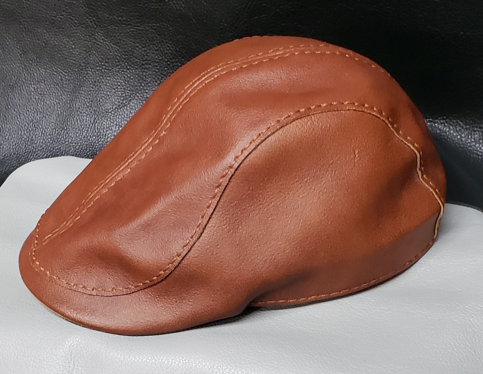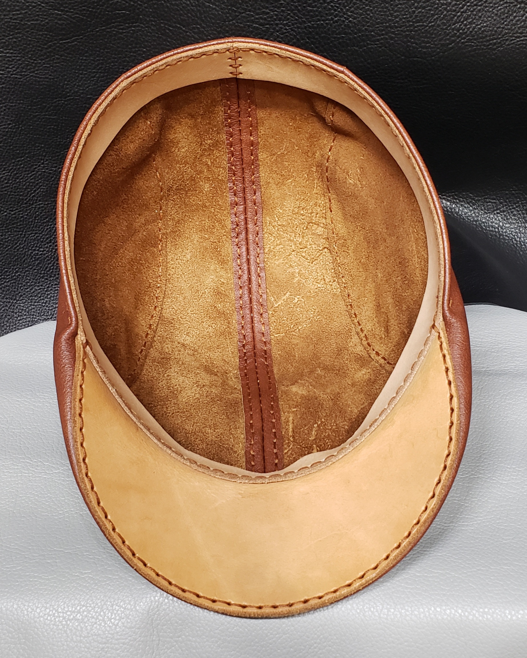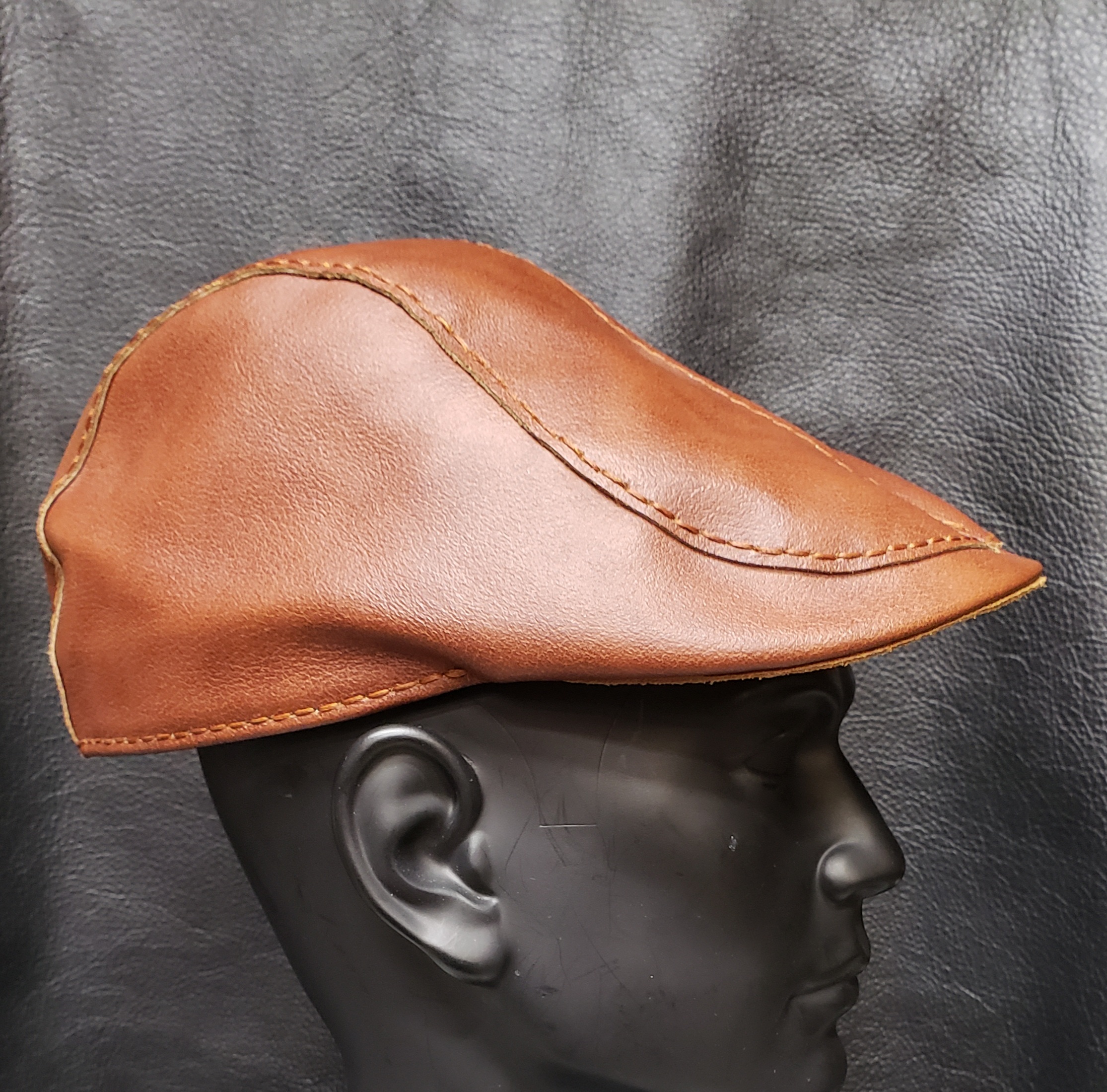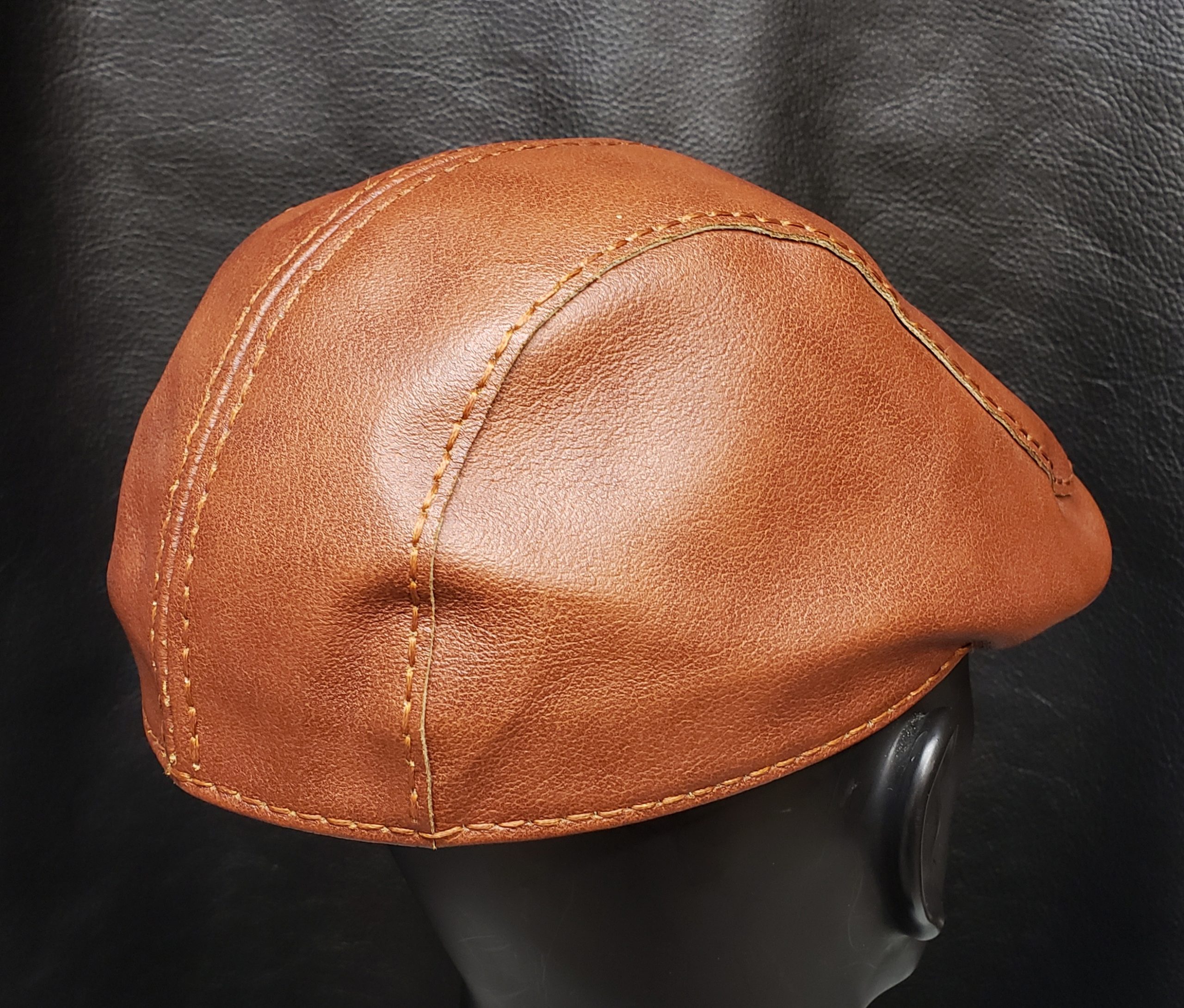 Each hat is made with beautiful Chrome-tanned leather in your choice of black or brown.ย Handsewn with 1mm waxed thread.