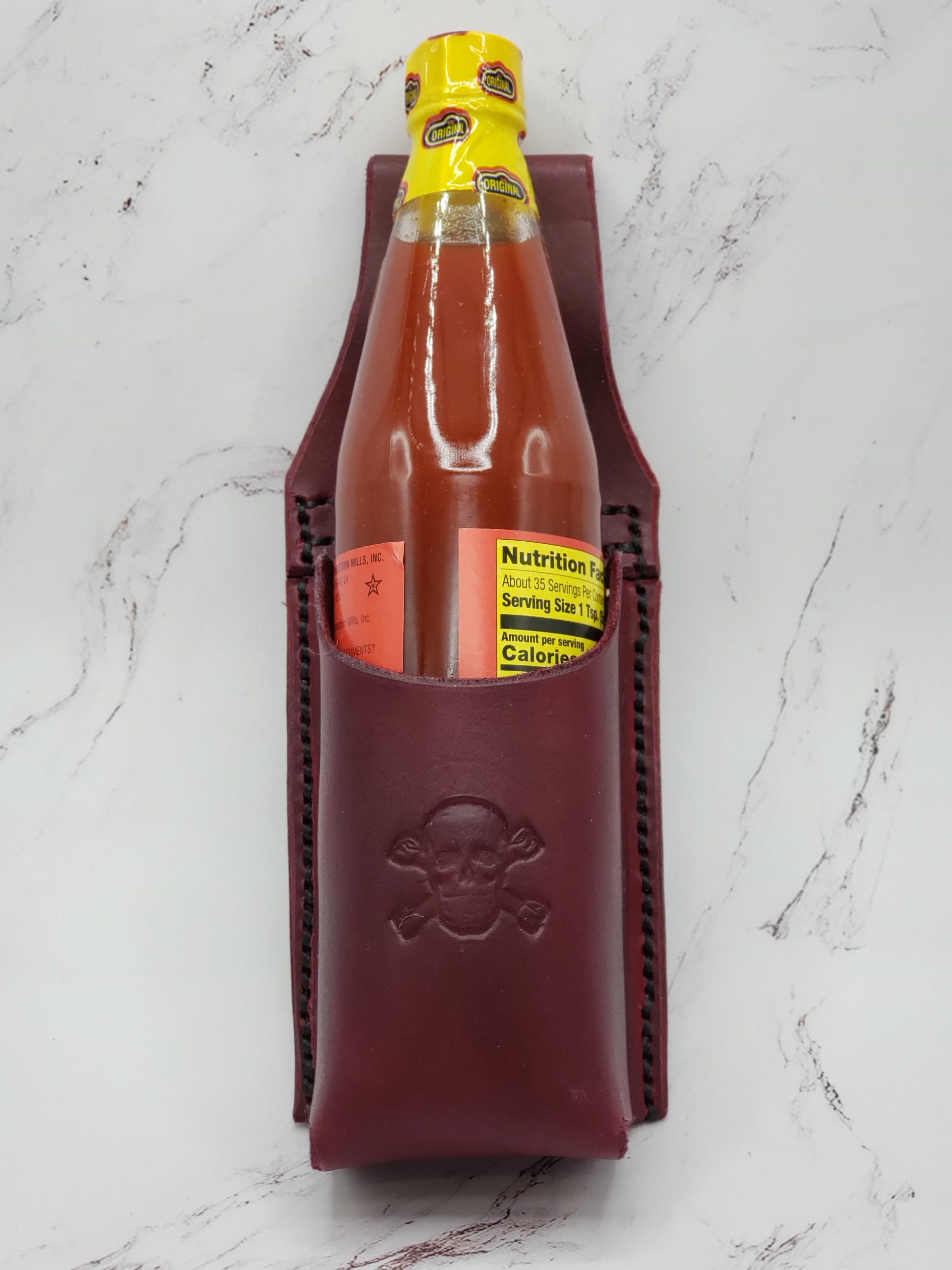 This handy holster fits on belts, up to 2 inches wide, and holds most 5 and 6 oz bottles of your go-to sauce.  The skull and crossbones logo on front let’s others know you don’t mess around with wimpy sauces.