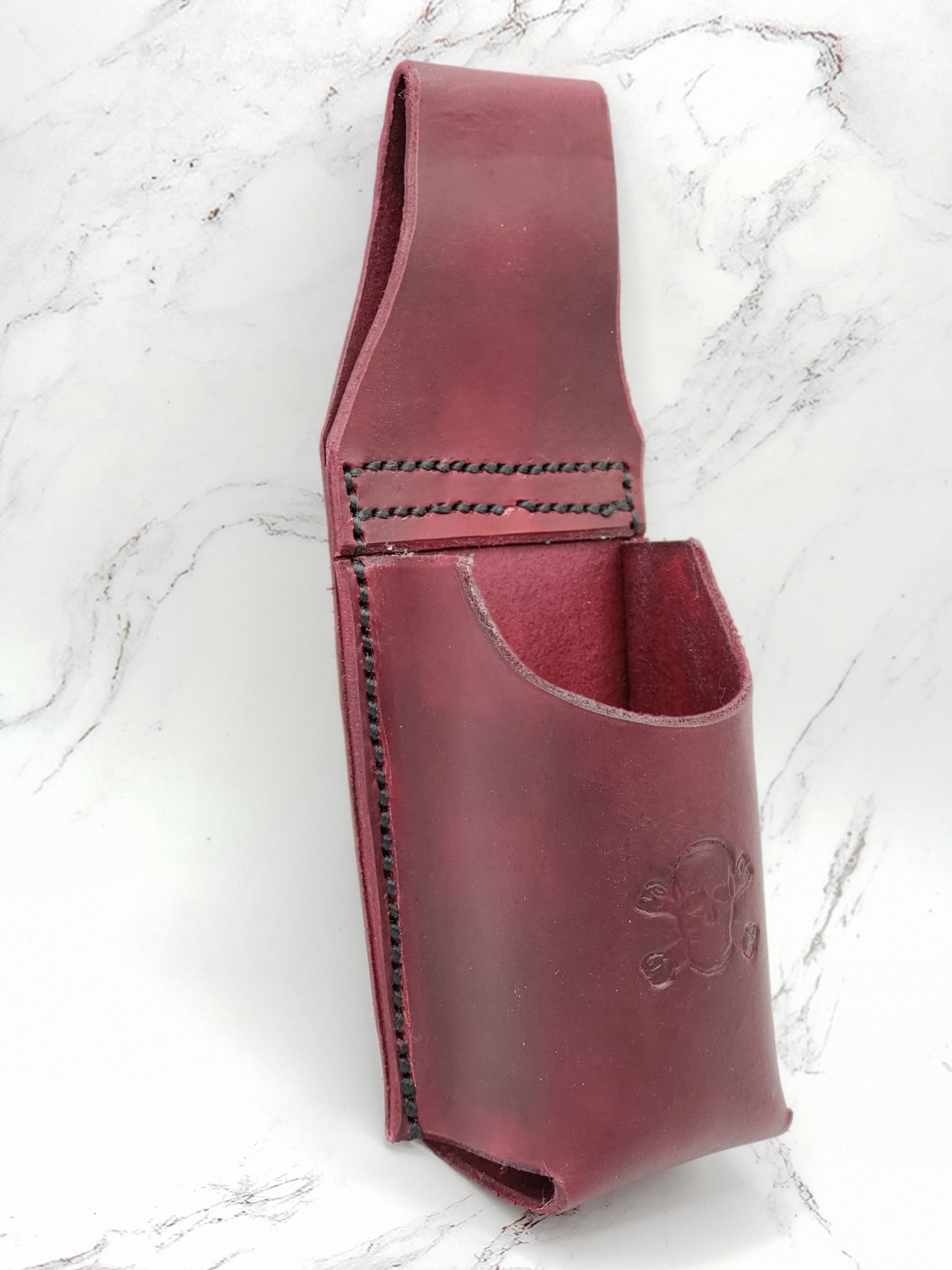 Your choice of 3 leather colors – Black, Brown, and Dark Red (shown) with matching stitching.  Made of sturdy 6oz vegetable tanned leather.