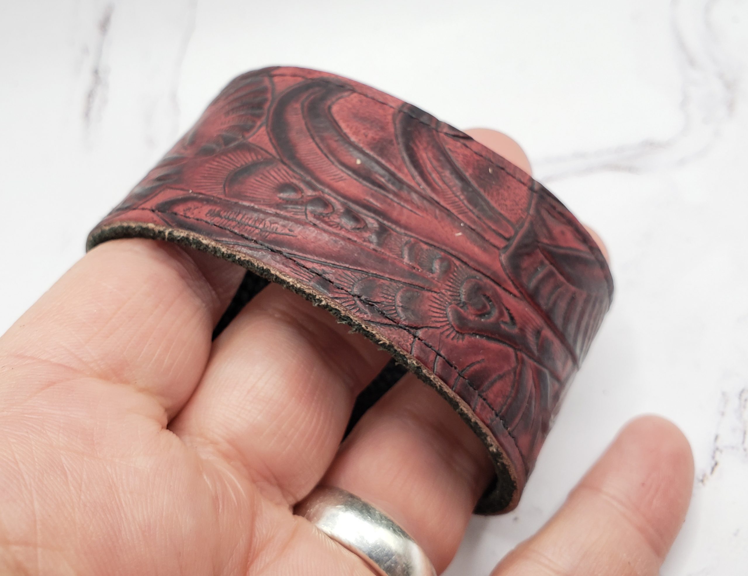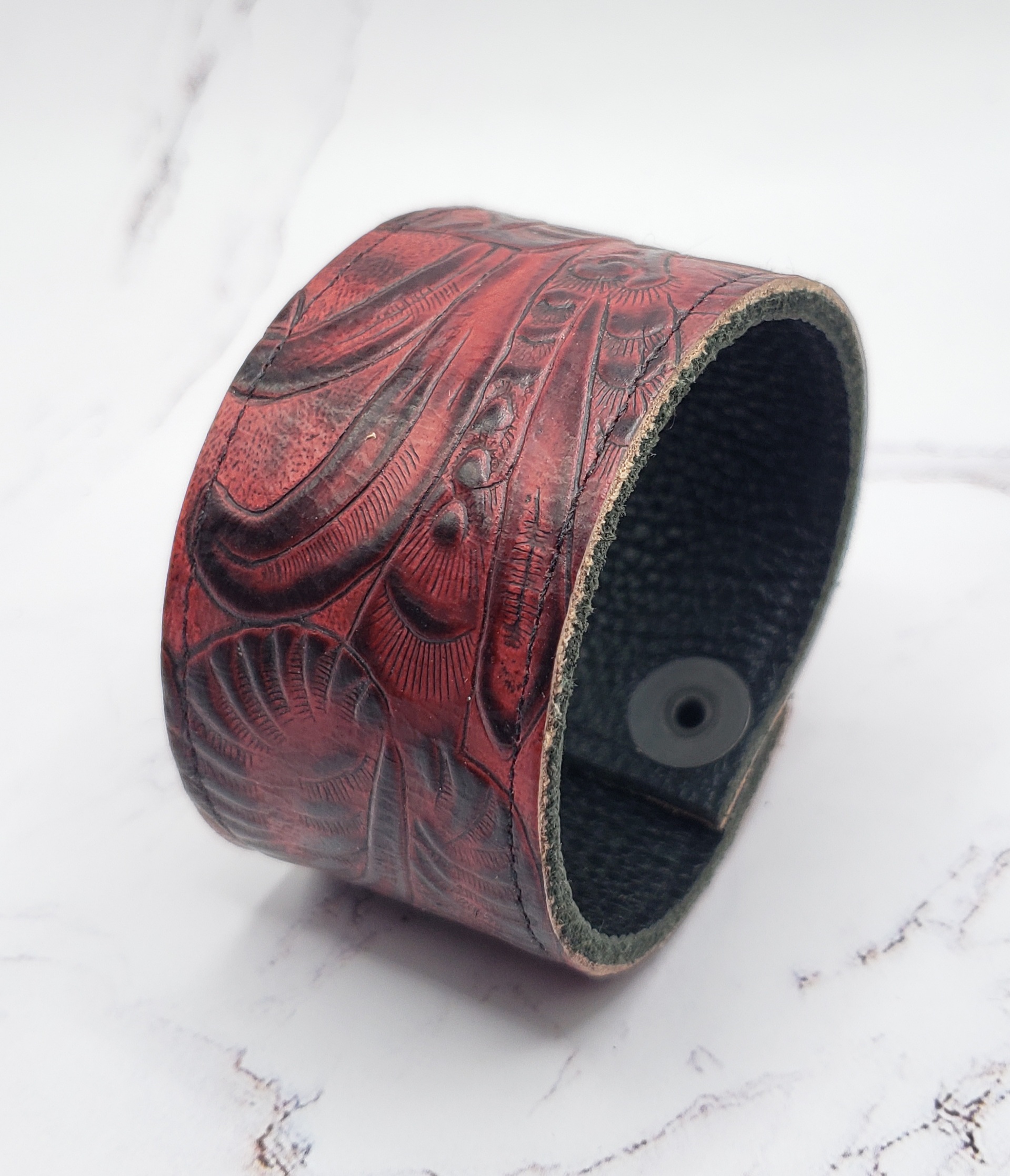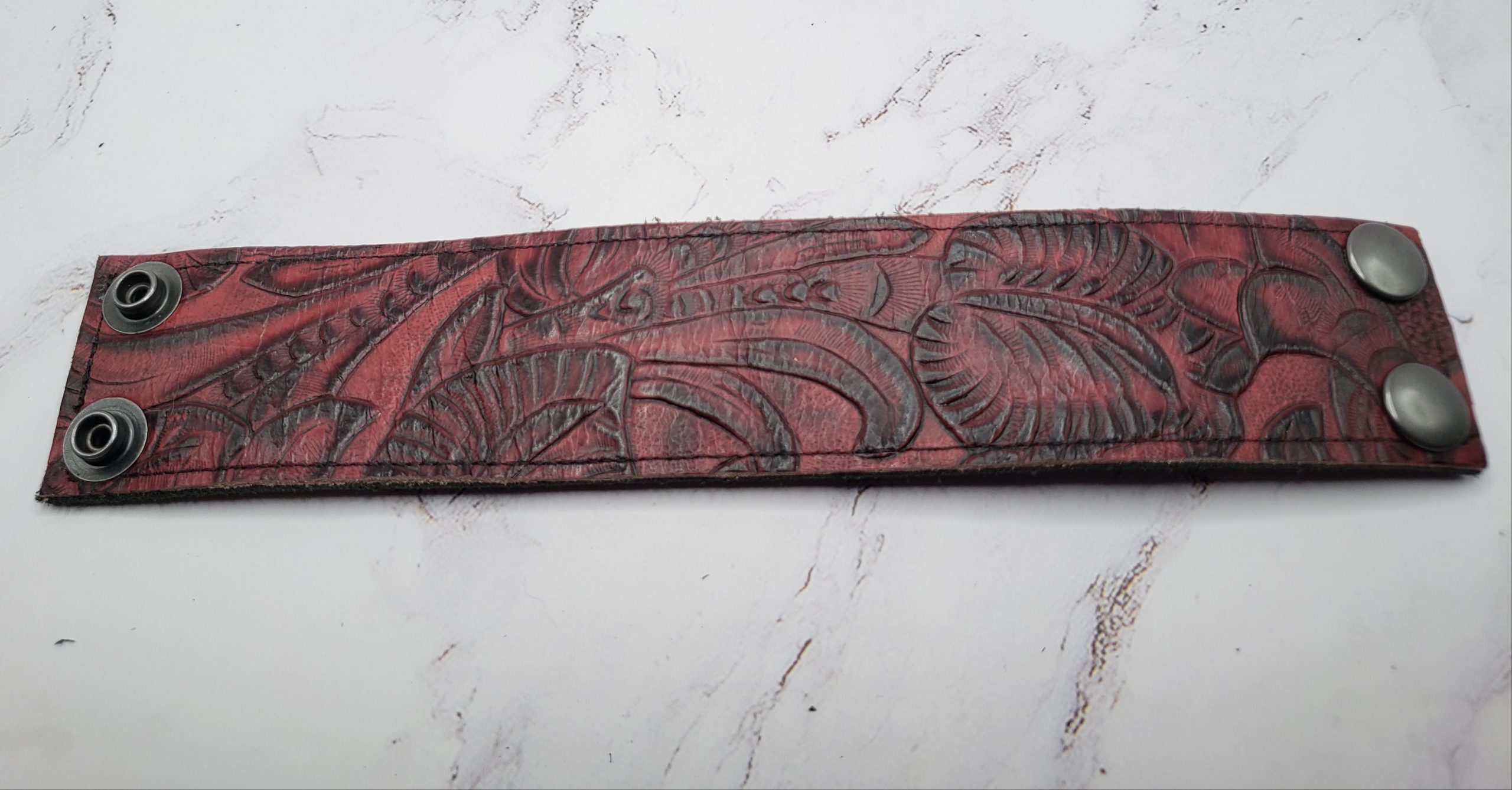 Dark red and black embossed leather is machine sewn with a black garment leather.