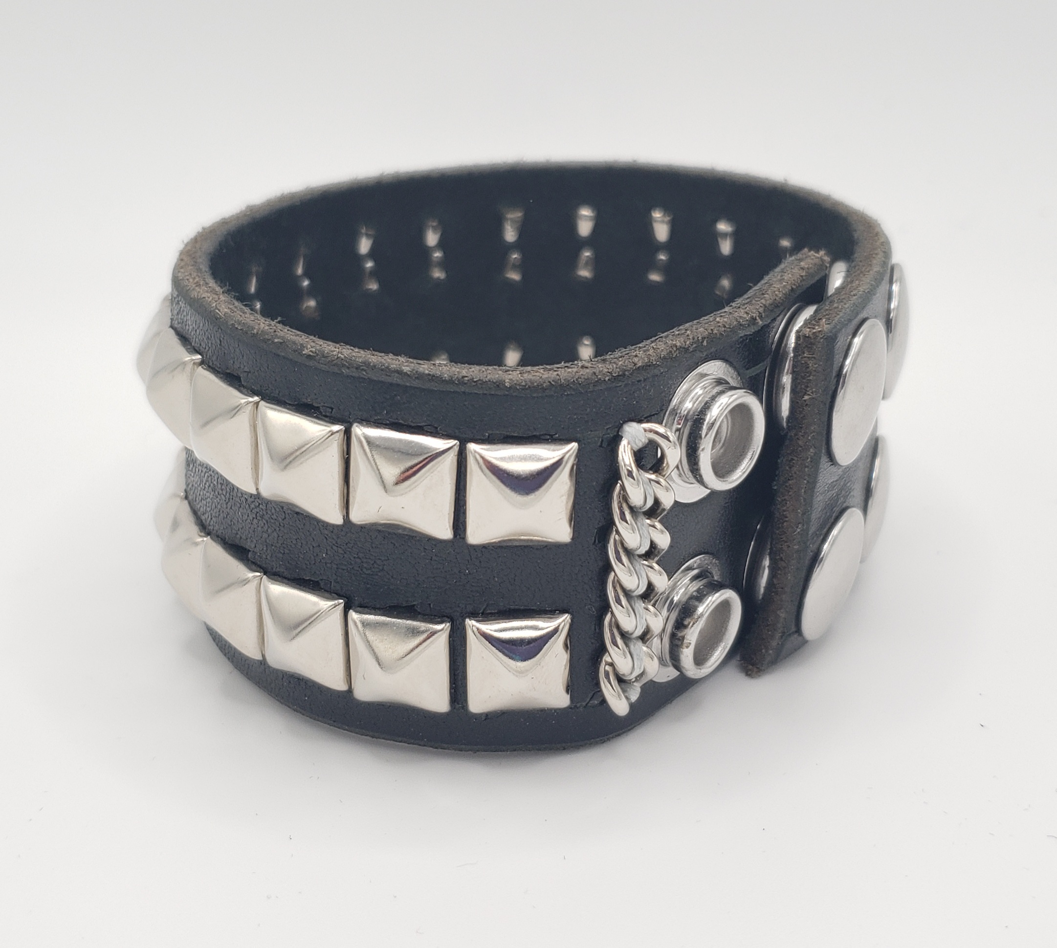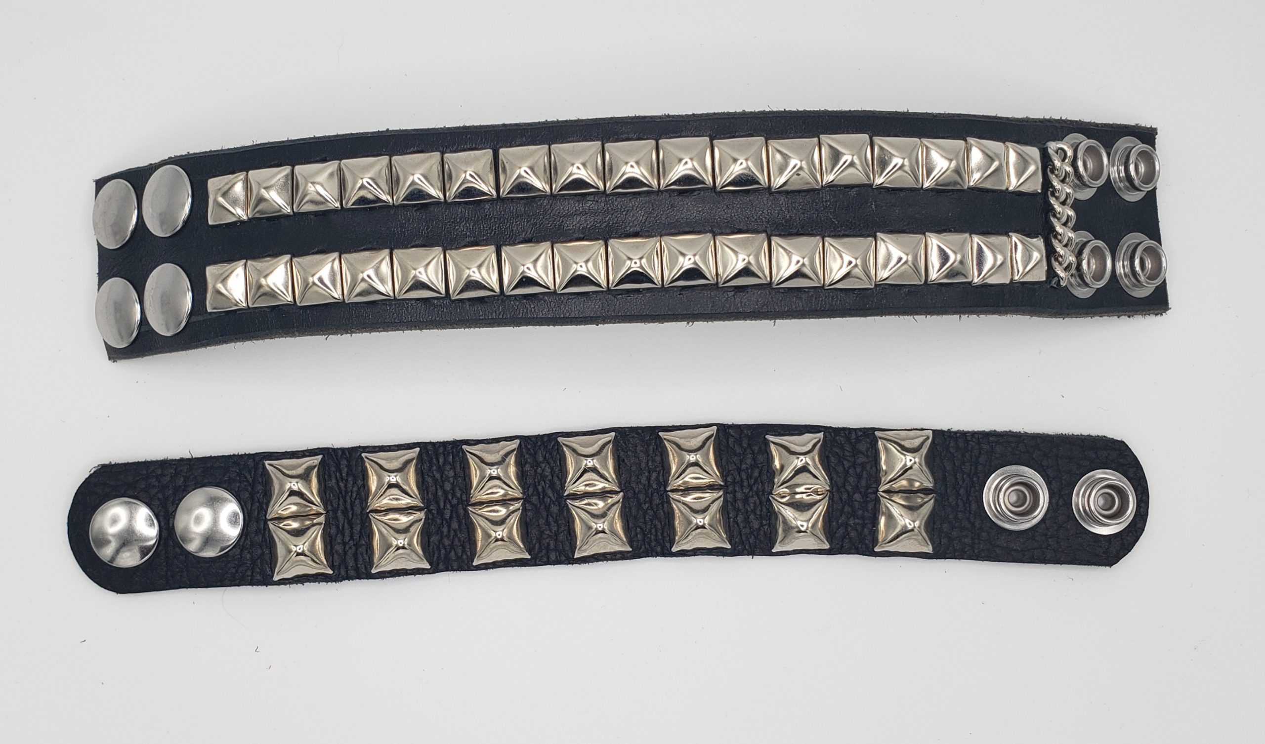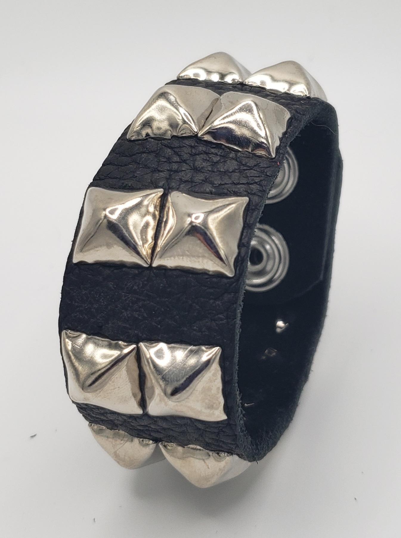 -Black bull hide leather with 2 sets of nickel-plated snaps fits 3 sizes – 6.75in, 7.75in, and 8.5in and is just over 1in wide. Two spaced rows of nickel-plated pyramid studs run along the cuff.